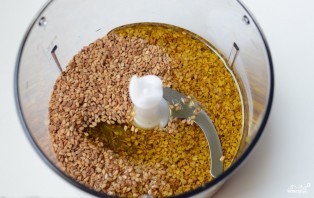 Выложите в блендер кунжутные семечки и залейте их оставшимся оливковым маслом.