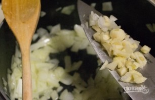 2. Очистите чеснок, нарежьте мелко зубчики, добавьте их в кастрюлю к луку, перемешайте и готовьте пару минут.