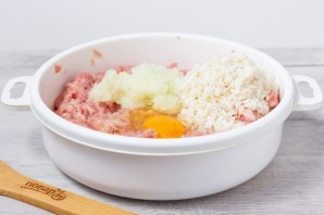 В фарш добавьте лук, пробитый блендером, яйцо и полуготовый рис. Тщательно перемешайте и посолите по вкусу.