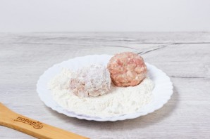 Влажными руками сформируйте шарики, обваляйте в муке. Фарша для одного ежика я беру одну столовую ложку.