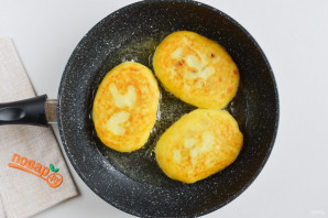 Очень хорошо разогрейте растительное масло в сковороде, обжаривайте оладьи партиями на большом огне до появления золотистой корочки.