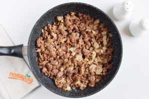 В сухой сковороде обжарьте фарш с луком, добавьте соль и перец по вкусу. Ложкой разбивайте мясные комочки, перемешивайте. В процессе фарш даст много жира и лук отлично обжарится.