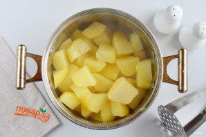 С картофеля слейте всю воду, выложите кусочек масла и толкушкой превратите в пюре. Совет! Не стоит пользоваться блендером, иначе картофель станет очень вязким и для рецепта не подойдет.