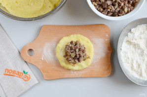 Возьмите в руки две столовые ложки картофельного теста, чтобы оно не липло к рукам, окуните их в муку немного. Расплющите, положите мясной фарш (примерно 1 ст.л. с большой горкой), защипните край, как в пирожках или варениках.