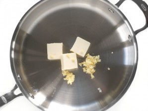 2. В сотейник выложите сливочное масло и чеснок, посолите и варите 2 минуты на слабом огне.