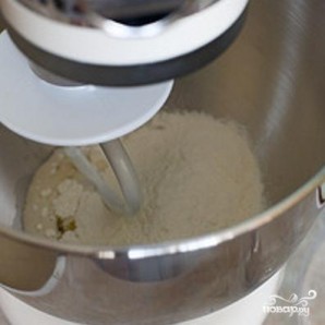 Туда же добавляем оливковое масло, чайную ложку соли и оставшуюся воду. Добавляем муку, месим тесто.