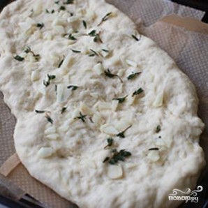 Раскатываем тесто в пласт, посыпаем его листьями тимьяна, мелко нарезанным чесноком, немного солим. Накрываем салфеткой, даем постоять еще 30 минут, после чего выпекаем в духовке 12 минут при 220 градусах. Готово!