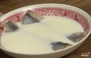 Филе сельди проверяем на наличие косточек, при обнаружении удаляем их. Укладываем рыбу в тарелку, заливаем молоком. Даём постоять около 30 минут.