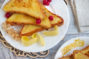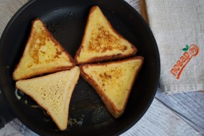 Хрустящая поджаристая корочка и нежный, тающий во рту мякиш. Тосты должны хорошо пропитаться в смеси, но при этом не разваливаться у вас руках Подавайте закуску к столу.