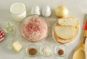 Переложите фарш в глубокую миску. Добавьте тертый на крупной терке лук, отжатый батон, соль и специи по вкусу.