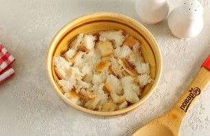 Батон раскрошите руками, залейте холодной водой, а потом отожмите.