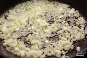 В широкой сковороде разогреваем оливковое масло, обжариваем в нем лук до прозрачности.