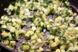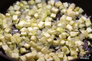 Затем добавляем к луку нарезанные на мелкие кубики кабачки. Обжариваем около 5 минут, постоянно помешивая.