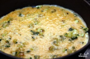 Выливаем сырно-яичную смесь на овощи, накрываем сковороду крышкой и тушим на среднем огне, пока не загустеет.