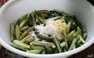Огурцы помойте, обрежьте у них попки, а затем порежьте на четверти по длине. Добавьте горчицу, чеснок, соль, перец, сахар и стакан уксуса. Оставьте часа на 3.