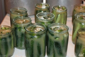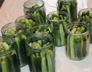 Банки простерилизуйте. Разложите по банкам огурцы.