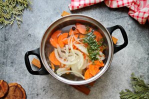 Морковь нарежьте тонкими кружочками, репчатый лук полукольцами, укроп мелко порежьте и добавьте в кастрюлю. Доведите до кипения, снимите с огня и остудите до теплого состояния.