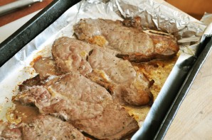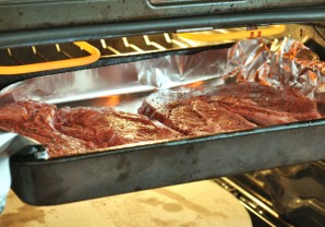 Включаем верхний гриль в духовке на максимум. Противень выстилаем фольгой и выкладываем на нее стейки. Решетку нужно поставить на самое верхнее отделение, чтоб мясо оказалось у самого жара.