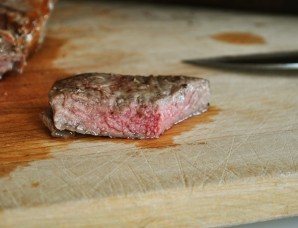 Через 3-4 минуты стейки переворачиваем и запекаем еще 2-3 минутки. Затем вытаскиваем мясо и даем ему отдохнуть в течение 5 минут.
