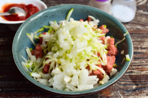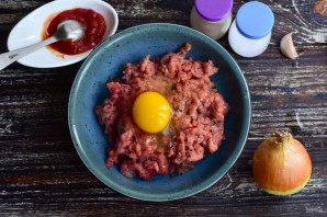 К фаршу сразу же вбейте куриное яйцо.