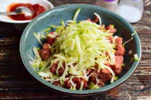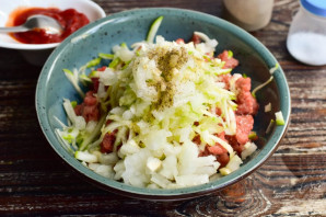 Всыпьте соль и перец черный молотый. Очень хорошо все перемешайте.