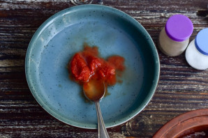 Томатную пасту выложите в миску и влейте немного воды. Перемешайте.