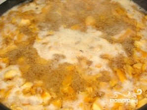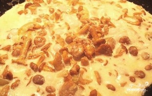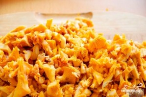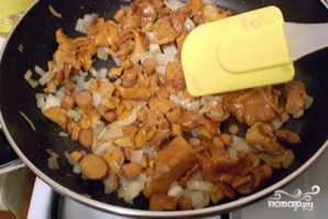 Добавить откинутые на сито лисички. Жарить 7-10 минут с луком.