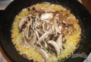 Добавьте на сковороду лук с грибами. Готовьте их в течение 6 минут, помешивая.