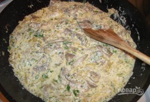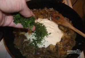 Потом добавьте сметану с зеленью. Тушите соус ещё 7-10 минут.
