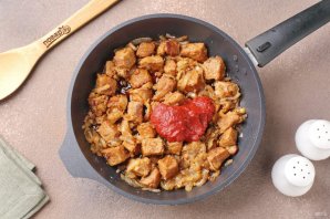 Затем добавьте муку и перемешайте. Влейте соевый соус, добавьте томатную пасту или свежие помидоры.