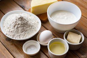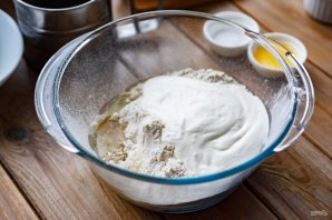 В миску просейте всю муку, добавьте соль, растительное масло и добавьте белок одного яйца (желток пойдет в начинку).