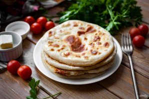 Каждую лепешку сразу после обжаривания смазывайте кусочком сливочного масла. Готовые хачапури сложите на плоскую тарелку стопочкой.