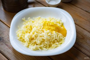 Сыр натрите на крупной терке, добавьте к нему 2 столовые ложки растопленного на маленьком огне в сотейнике сливочного масла и оставшийся яичный желток. Перемешайте все — это начинка.