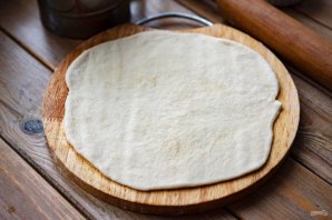 Поделите все тесто на несколько частей (у меня 4 части). Одну часть муки раскатайте скалкой в круглую лепешку толщиной в 3-4 мм.