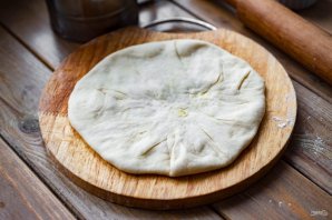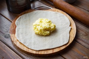 Защипите края теста в виде мешочка с начинкой внутри, а затем аккуратно скалкой этот мешочек раскатайте в лепешку.