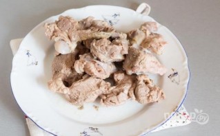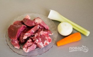 1. Вымойте как следует мясо, очистите овощи для бульона. Выложите все в кастрюлю, залейте водой и поставьте на огонь. После закипания уберите пену, уменьшите огонь и варите до готовности мяса пару часов.