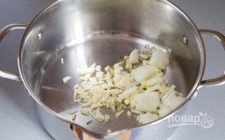 2. Измельчите лук с чесноком и обжарьте на растительном масле до румяности.
