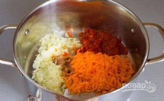 4. Добавьте немного специй, тертую морковь и пару ложек томатного соуса (можно пару измельченных помидоров без кожицы).