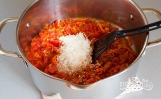 7. Выложите в кастрюлю помидоры, рис и влейте бульон. Доведите до кипения, подсолите и добавьте специи. Варите на медленном огне минут 10-12.