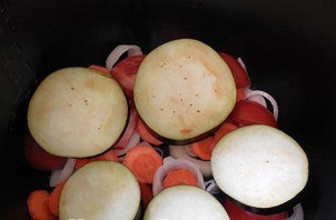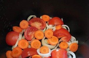 Крупно порежьте овощи и мясо. Налейте на дно чаши мультиварки немного растительного масла и выложите овощи и мясо слоями. Сначала выложите лук, морковь и половину помидор.