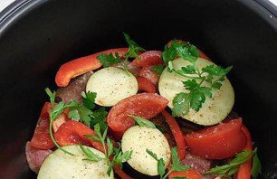 Идеальный вариант для приготовления в мультиварке – это хашлама по-армянски. Чтобы её приготовить крупно нарежьте мясо и овощи. Налейте в мультиварку немного растительного масла и выложите ингредиенты слоями в следующей последовательности: лук, морковь, половина помидор, половина баклажан и мясо. На этом этапе посолите и приправьте хмели-сунели по вкусу. Затем выложите слои перца, вторую половину помидор и баклажан. Сверху посыпьте свежей зеленью, еще посолите и посыпьте приправой. Тушите 1 час 20 минут. Готовое блюдо украсьте веточками зелени и подавайте на стол