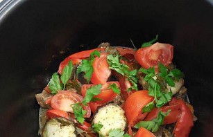 Выложите оставшиеся овощи – перец, вторую половину помидор и баклажан. Посыпьте свежей зеленью, еще посолите и посыпьте приправой. Воды не добавляйте, в процессе готовки выделится достаточно сока.