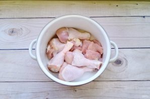 Куриные голени и индейку промойте и выложите в кастрюлю.