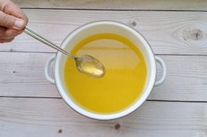 Варите холодец на самом минимальном огне. Он должен буквально томиться. Тогда бульон будет прозрачным. Холодец из голеней и индейки совсем нежирный. Поэтому можно в бульон добавить четверть чайной ложки куркумы для цвета. За 10-15 минут до окончания приготовления добавьте в кастрюлю соль, перец черный молотый и лавровый лист.