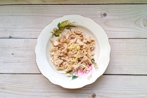 Курицу освободите от костей и шкурки. Должна остаться одна мякоть. Мелко нарежьте куриное мясо с мясом индейки и разложите по тарелкам. В каждую тарелку добавьте один крупный зубчик измельченного чеснока.