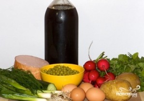 Готовим заранее продукты для приготовления холодника. Отвариваем картофель и яйца, открываем баночку с горошком и сливаем воду.