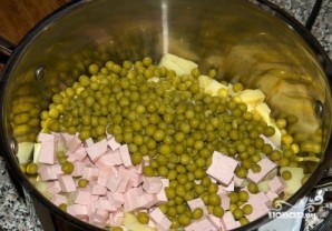 Добавляем в миску зеленый горошек.