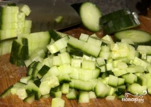 Огурец нарезаем мелкими кубиками. Можно очистить их от кожуры.