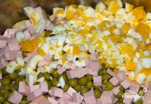 Яйца, сваренные вкрутую нарезаем мелко и добавляем в миску.