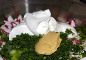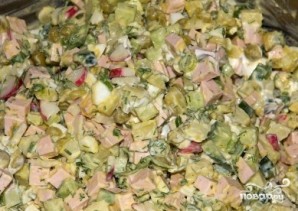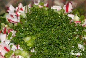Редиску, зеленый лук и укроп так же измельчаем и отправляем в миску.